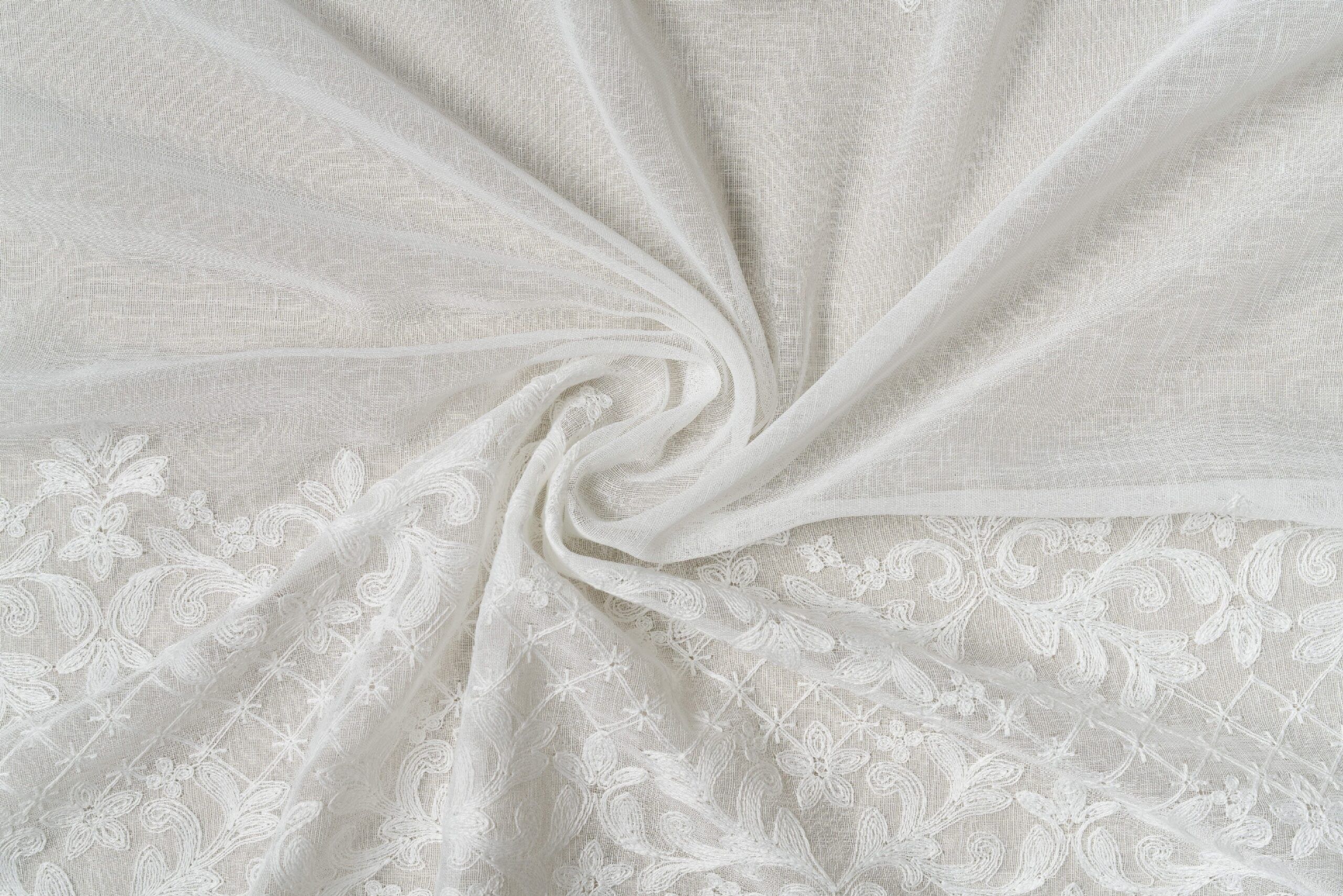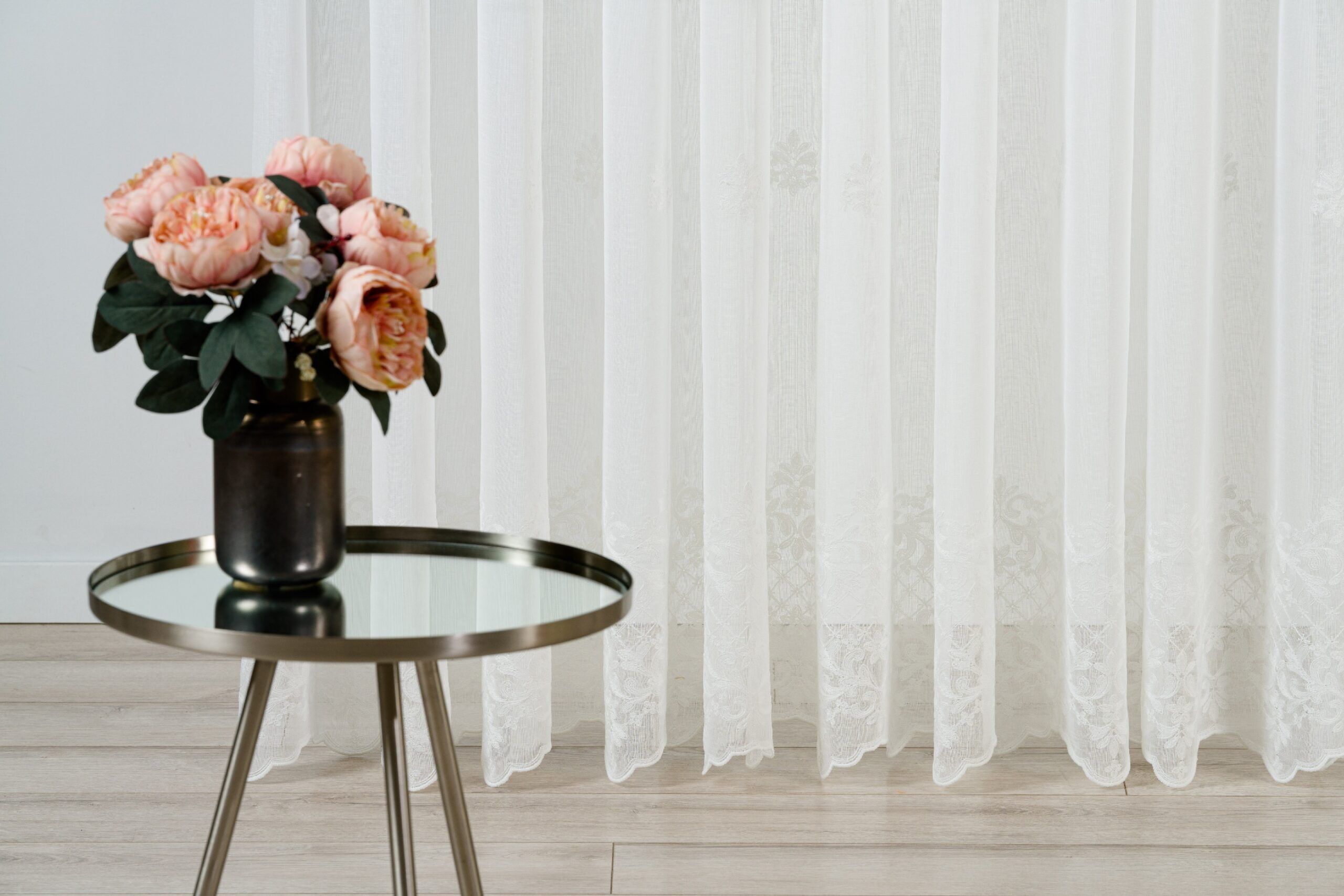Perdea crem cu un model abstract ce constă în forme specifice stilului de amenajare clasic.