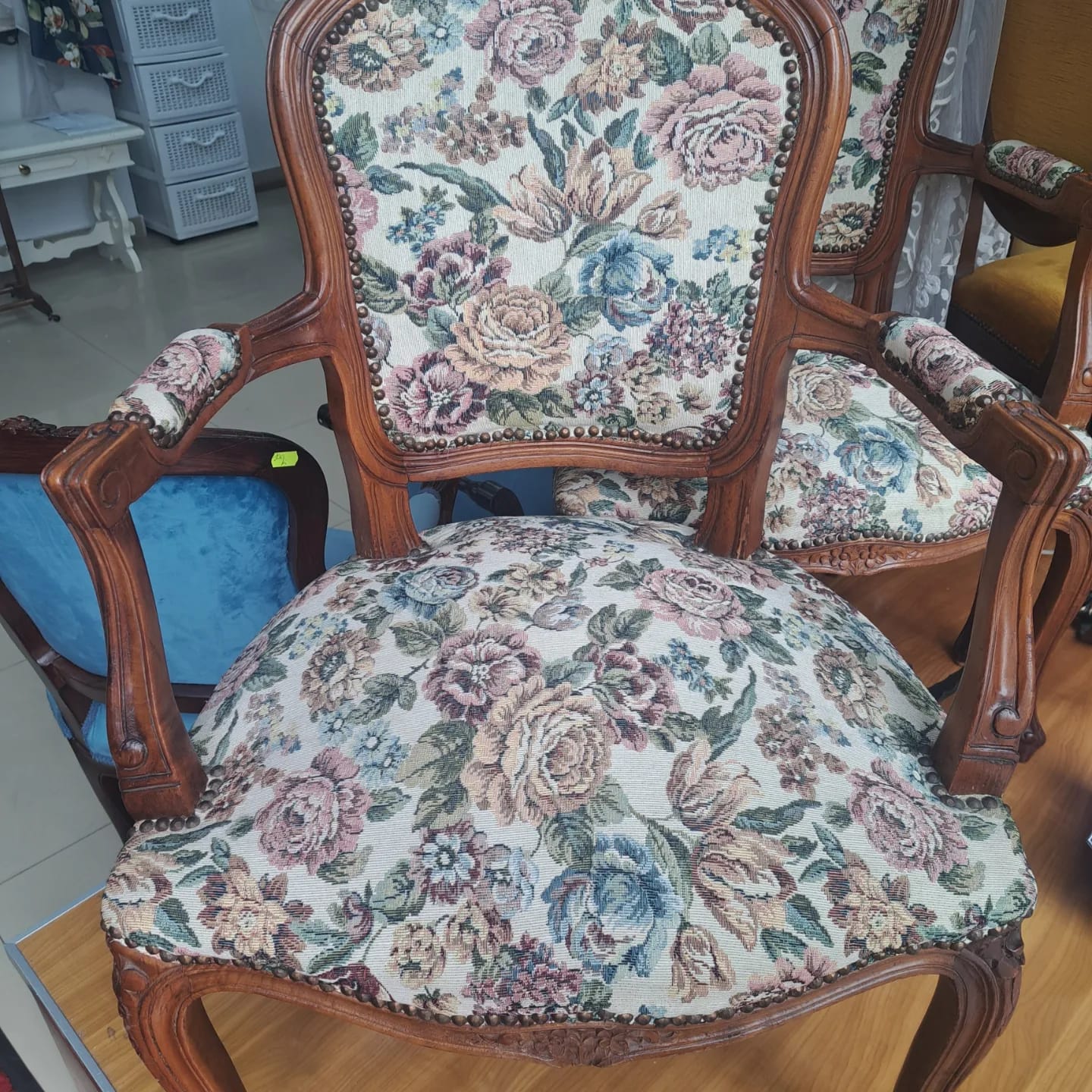 Set scaune cu brațe, stil baroc, tapițerie florală.