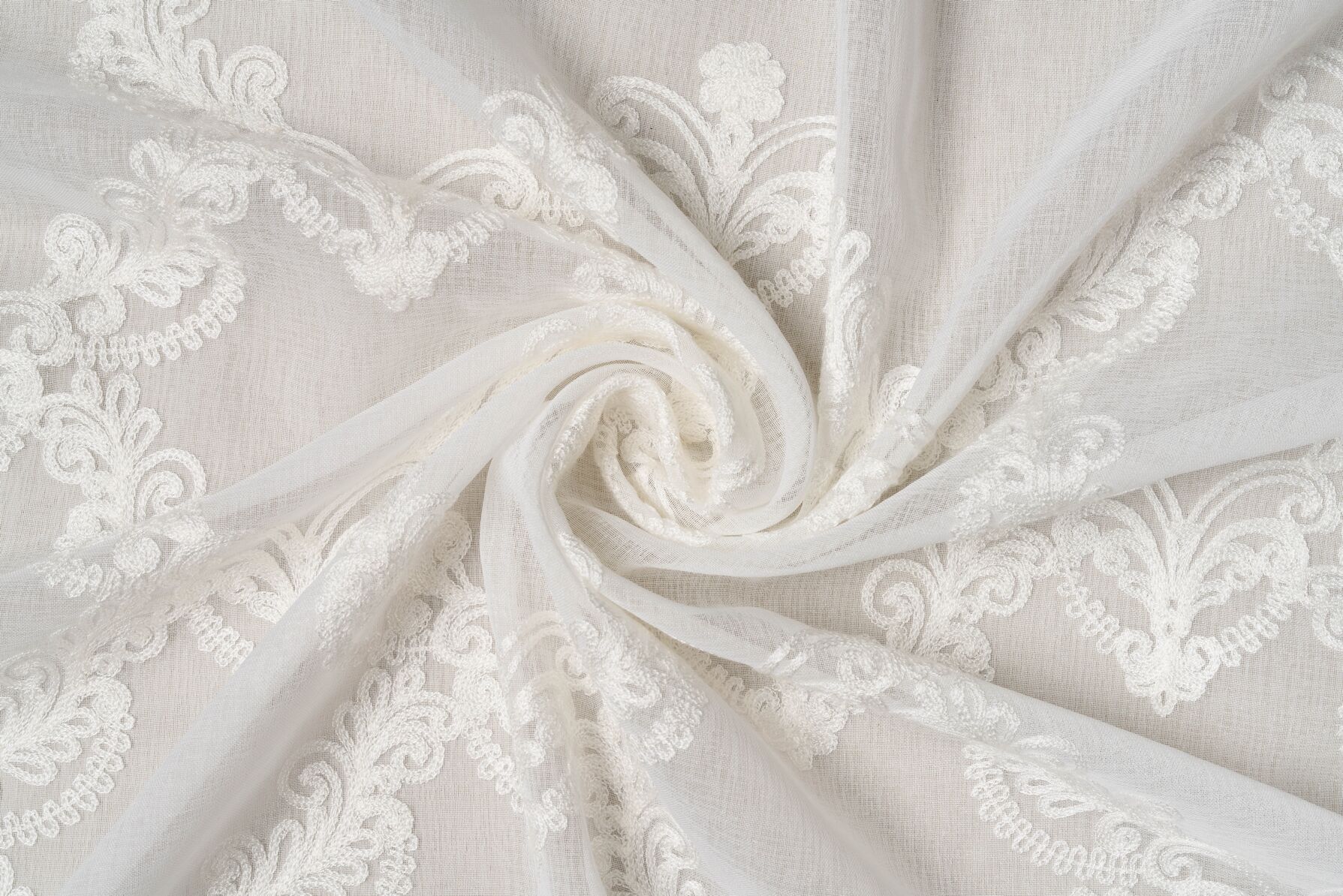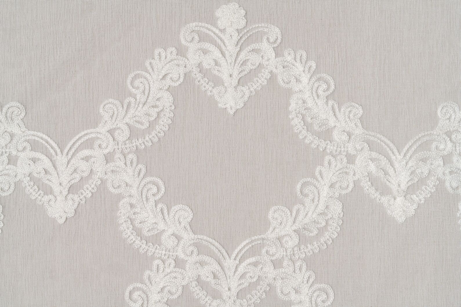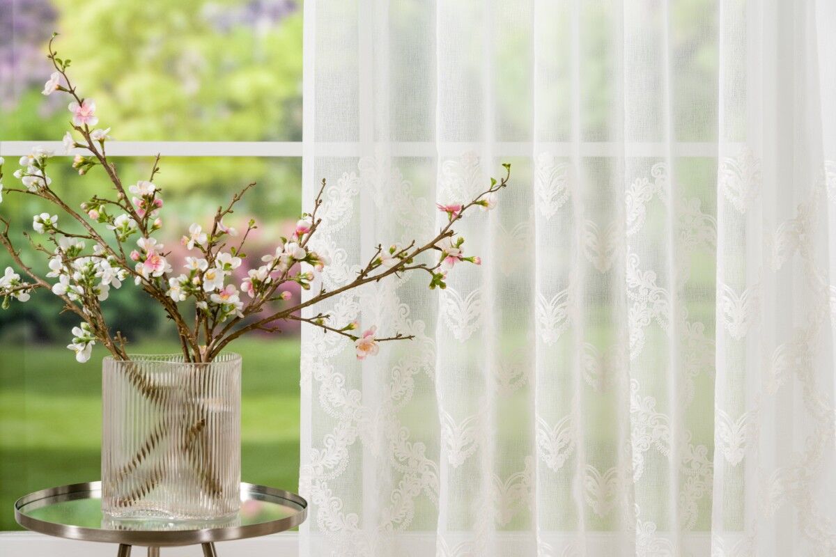 Yasmine aduce un plus de eleganță clasică încăperii, grație broderiei elegante. Broderia fină este prezentă în jumătatea de jos a perdelei. Baza materialului este simplă, vaporoasă, țesătura fiind de tip batiste.